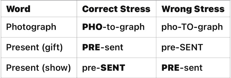 In English, some syllables are stronger (stressed) than others. Incorrect stress changes the meaning of words.