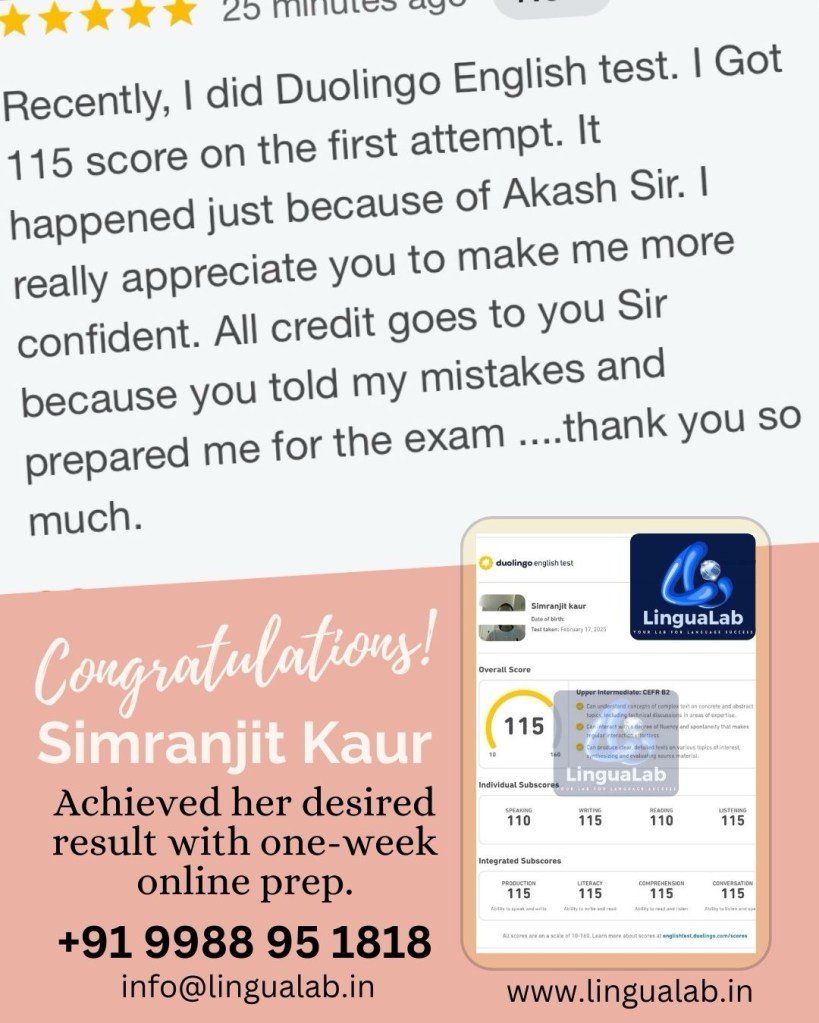 At Lingua Lab, we provide expert guidance and structured preparation to help you ace the Duolingo English Test (DET). With a deep understanding of the test format, question types, and evaluation criteria, our coaching ensures you build the necessary skills to achieve your target score.