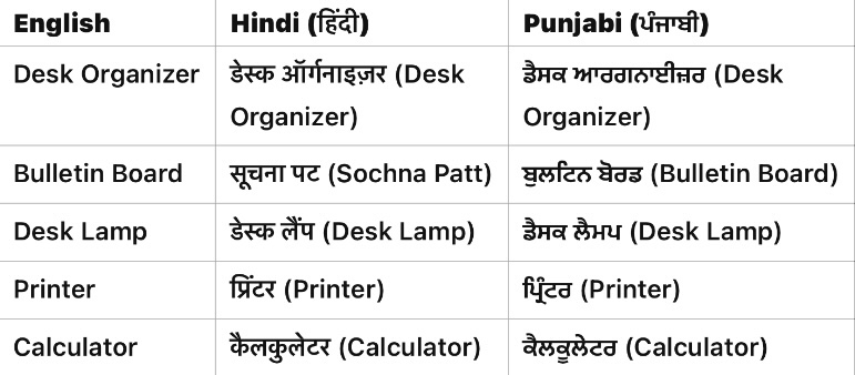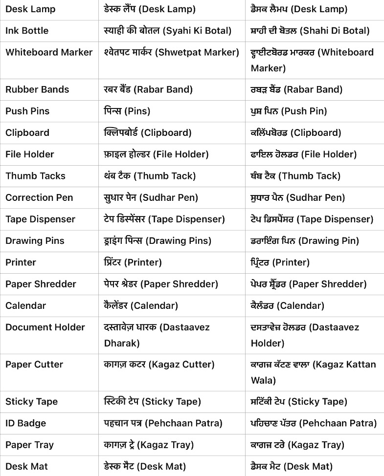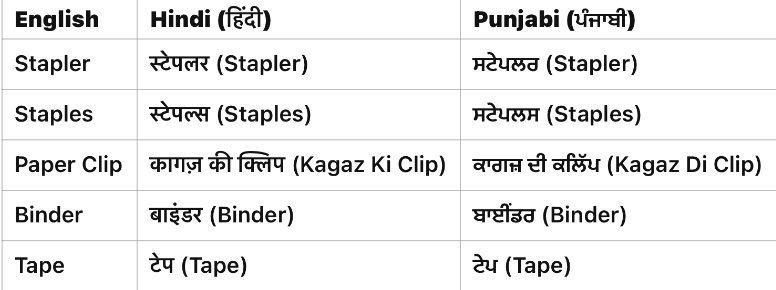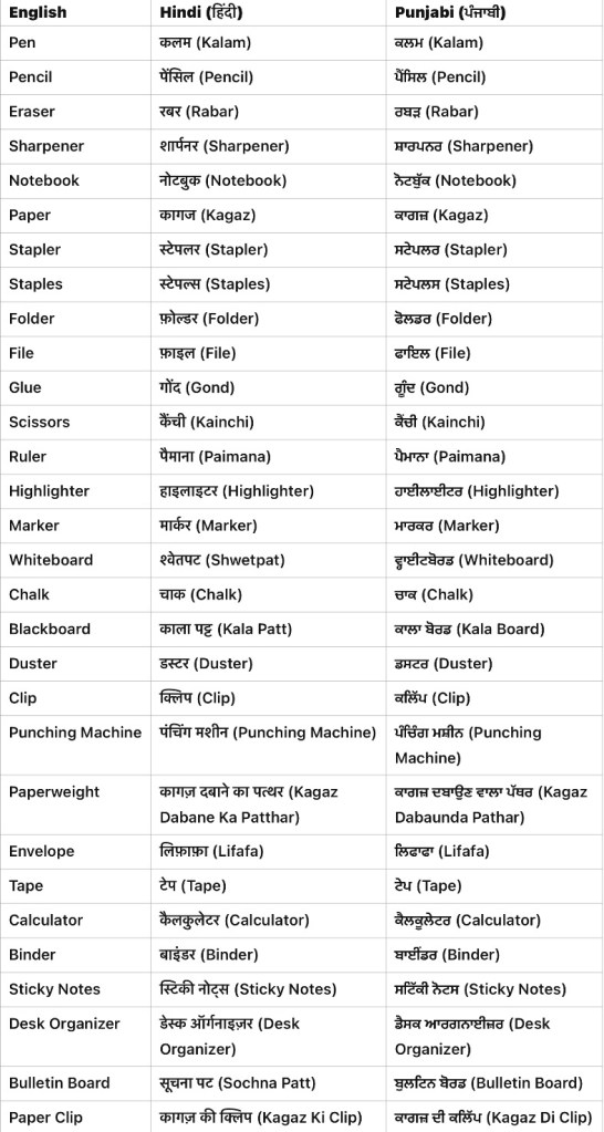 Here’s a list of essential office and stationery items in English, Hindi, and Punjabi: