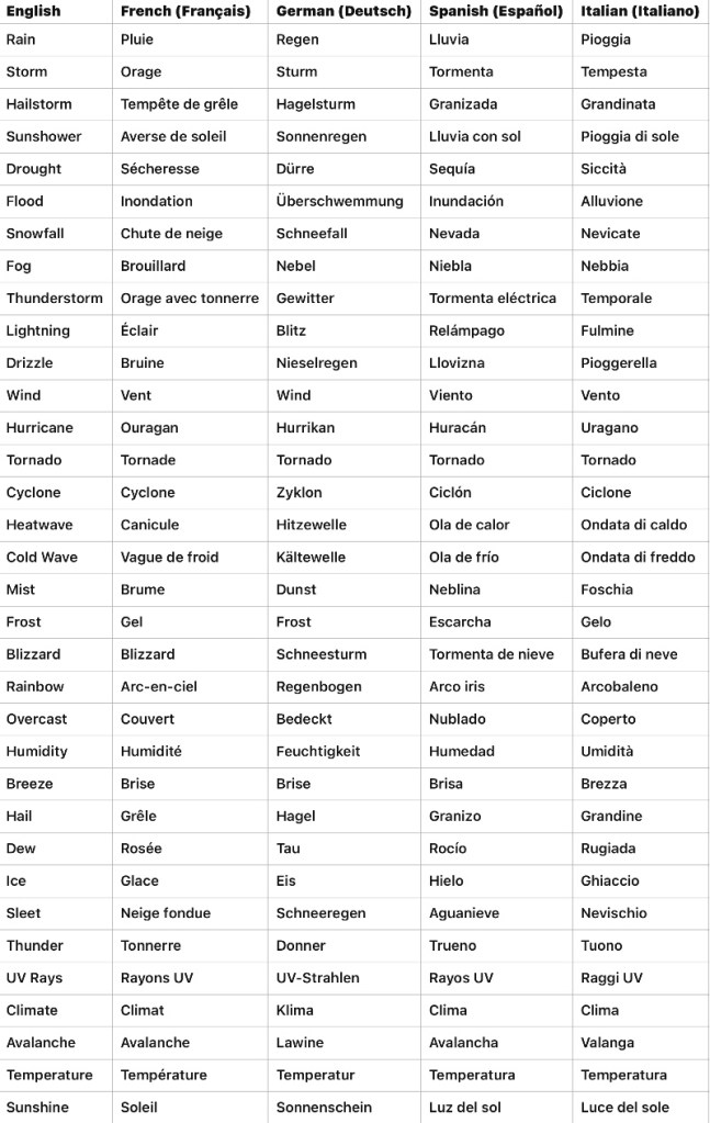 Knowing weather terms can be extremely useful when traveling. Imagine you’re in France, Germany, Spain, or Italy, and you need to check the weather forecast or understand emergency announcements regarding storms, heatwaves, or snowfall.